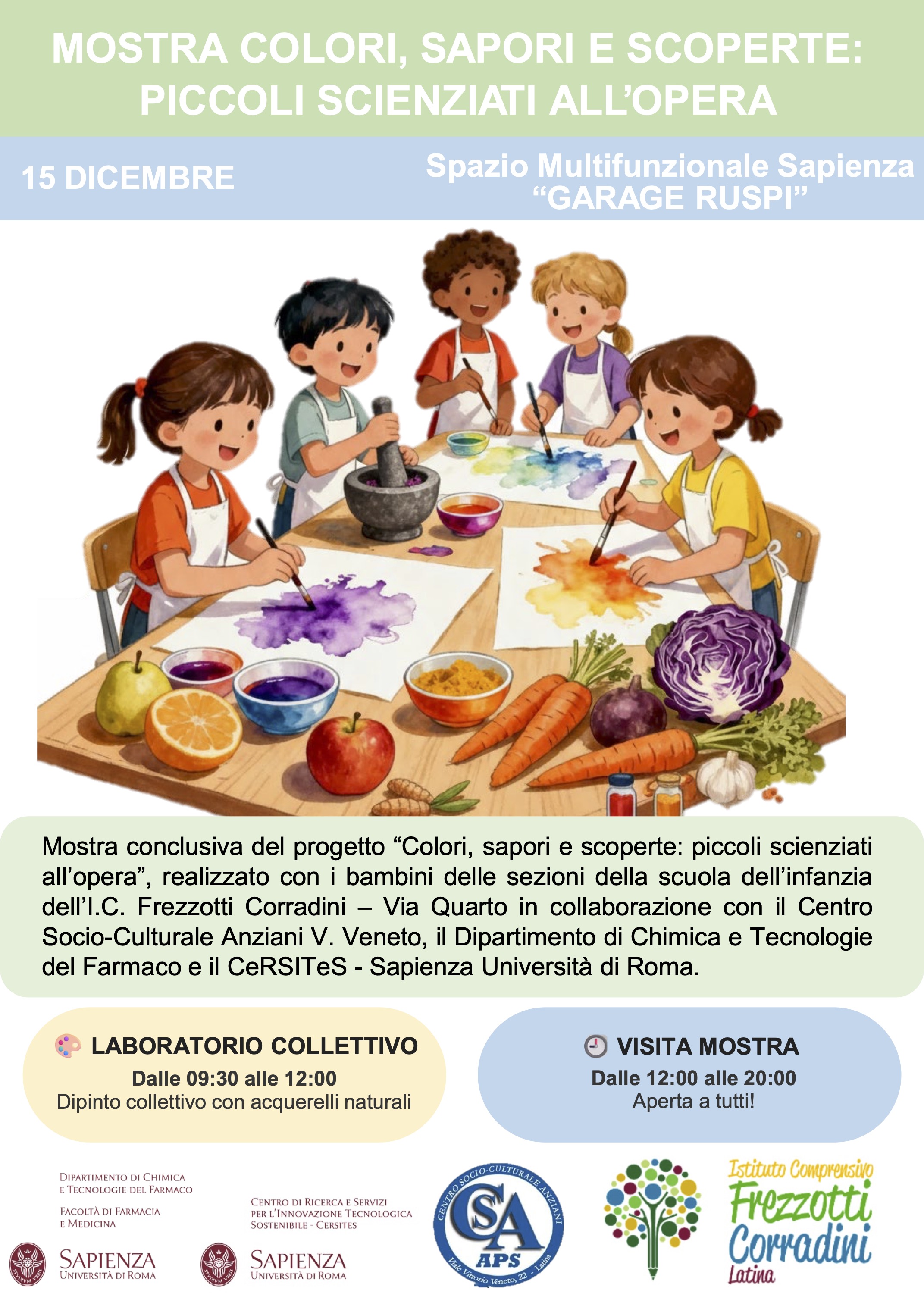 Lunedi 15 dicembre 2025GARAGE RUSPI Chiusura della sala studio per Mostra "Colori, Sapori e Scoperte"nell'ambito delle attività di Terza Missione Sapienza Università di Roma Data notizia: 10 Dicembre 2025 Allegati Locandina-Mostra_15.12.25.pdf (334.11 KB)Agenda_Mostra_15.12.25.pdf (272.48 KB)